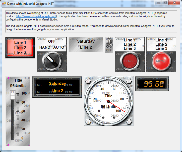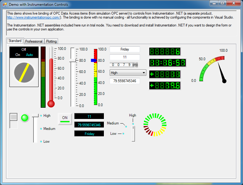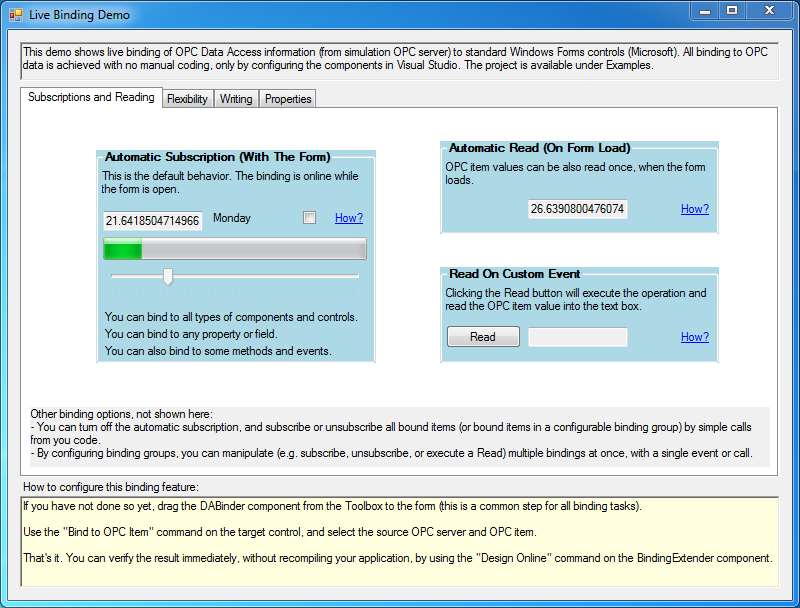 Following screens (click a picture below to enlarge) are taken from examples that are installed with QuickOPC. The demos show live binding of OPC Unified Architecture and OPC Data Access items to standard Microsoft controls, and to controls from 3rd-party products.